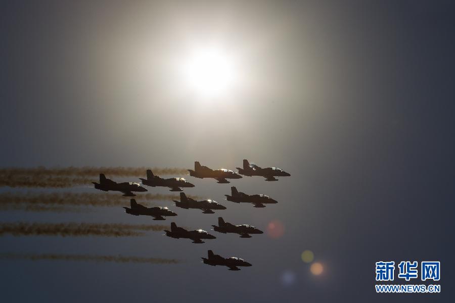 8月3日,在匈牙利中部的凱奇凱梅特空軍基地,來自意大利空軍的“三色箭”飛行表演隊在匈牙利國際航空展上表演。 新華社發(弗爾季·奧蒂洛攝)