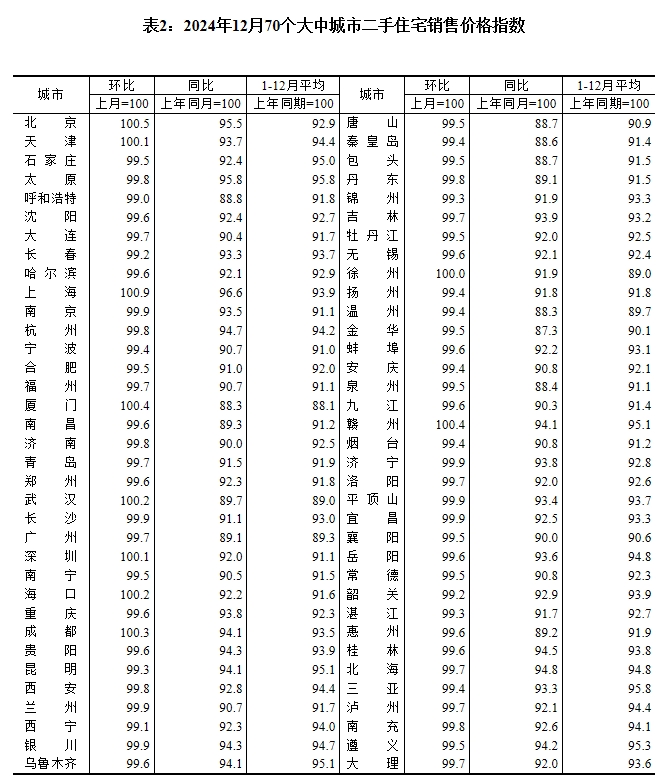 中國經濟網北京1月17日(記者 李方) 17日,國家統計局發布2024年12月份70個大中城市商品住宅銷售價格變動情況統計數據。數據顯示,2024年12月份,70個大中城市中,一線城市商品住宅銷售價格環比上漲,二三線城市環比總體降幅收窄;一二三線城市同比降幅均繼續收窄。