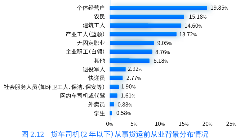 不僅如此,報(bào)告中還提到,過往貨運(yùn)行業(yè)對(duì)傳統(tǒng)行業(yè)從業(yè)者的吸引力較強(qiáng),多為農(nóng)民、個(gè)體經(jīng)營(yíng)戶、產(chǎn)業(yè)工人(藍(lán)領(lǐng))、無(wú)固定職業(yè)、建筑工人等群體。而近幾年,轉(zhuǎn)型從事貨車司機(jī)的職業(yè)還包含了企業(yè)職工(白領(lǐng))、社會(huì)服務(wù)人員、學(xué)生等,另外,外賣員、快遞員、網(wǎng)約車司機(jī)及代駕司機(jī)等新型靈活就業(yè)者也有部分人群選擇轉(zhuǎn)行成為貨車司機(jī)。