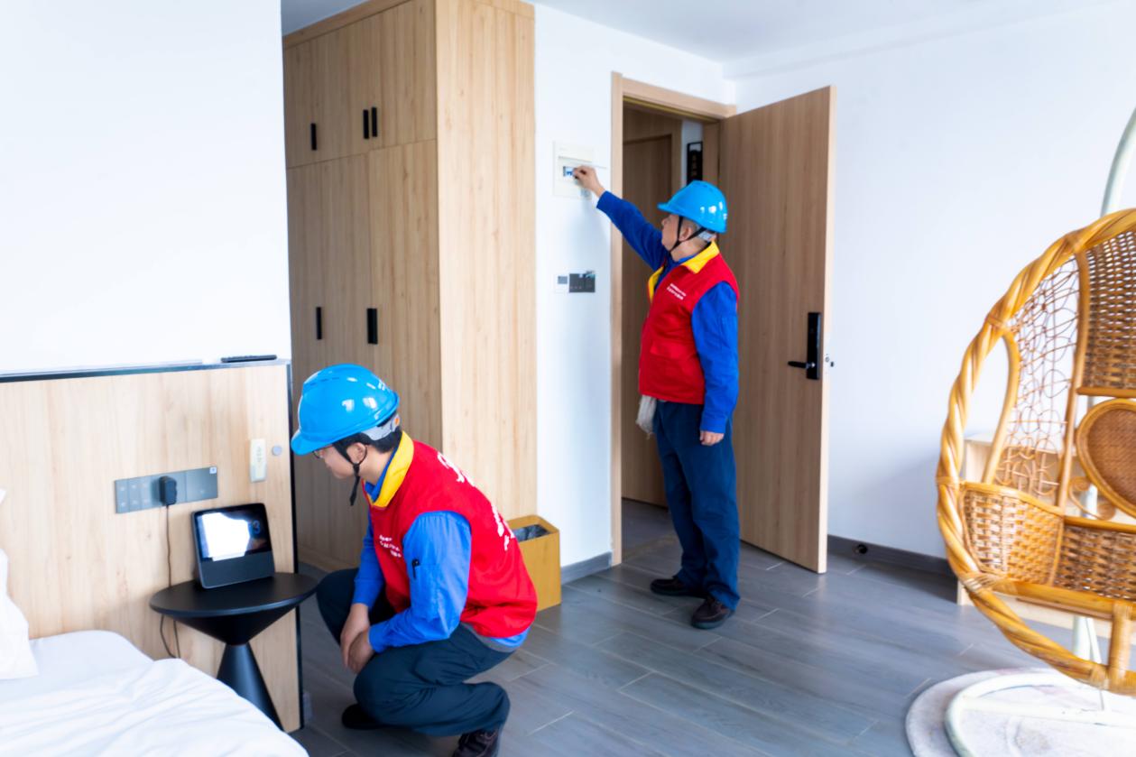 “插排不要同時接這么多大功率電器,容易引發短路。”在排查整治的同時,服務隊隊員充分發揮專業優勢,向民宿從業人員發放安全用電手冊,現場講解安全用電知識,耐心解答日常用電中遇到的各類問題。針對檢查中發現的問題,能夠當場解決的立即處理;需要后續跟進的,則建立臺賬,明確整改時限和責任人,確保問題整改到位,從源頭上消除安全隱患,為游客營造安全、舒適的住宿環境。
