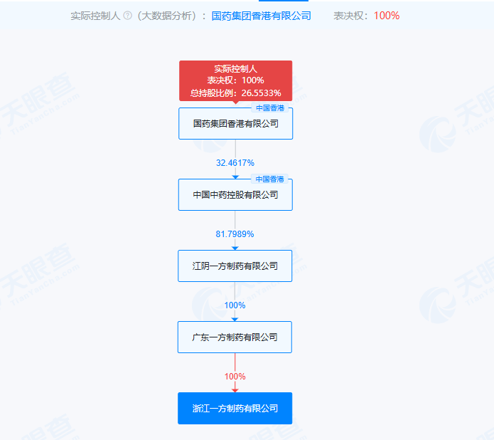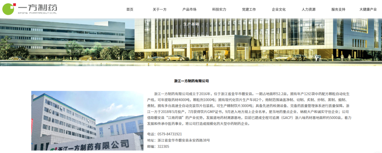 一方制藥官網(wǎng)介紹,浙江一方制藥有限公司成立于2016年,位于浙江省金華市磐安縣,公司于2018年5月投產(chǎn),7月獲得飲片GMP證書,9月進入地方規(guī)上企業(yè)名單,是當(dāng)?shù)氐闹攸c企業(yè)、納稅大戶和誠實守信企業(yè)。天眼查顯示,國藥集團香港有限公司為浙江一方制藥有限公司實控人。