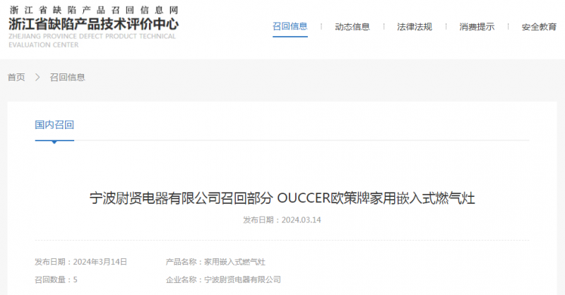 日前,寧波尉賢電器有限公司受缺陷調查影響按照《消費品召回管理暫行規定》的要求,主動向浙江省市場監督管理局和寧波市市場監督管理局報告了召回計劃,將自即日起,召回2023年3月1日期間制造的OUCCER歐策牌JZY-OC20型號家用嵌入式燃氣灶,涉及數量為5件。