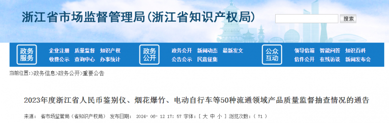 2024年6月12日,浙江省市場監(jiān)督管理局網(wǎng)站發(fā)布2023年度浙江省人民幣鑒別儀、煙花爆竹、按摩器具、電動自行車等50種流通領域產(chǎn)品質(zhì)量監(jiān)督抽查情況的通告。