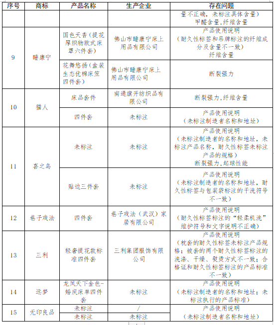 試驗(yàn)發(fā)現(xiàn),遠(yuǎn)夢(mèng)、巷子戲法、三利、雅鹿、喜之鳥(niǎo)、無(wú)印良品、睡康寧、貓人、曼凡MANFAN的11件樣品產(chǎn)品使用說(shuō)明不規(guī)范或不正確。產(chǎn)品使用說(shuō)明標(biāo)簽應(yīng)包括產(chǎn)品名稱(chēng)、產(chǎn)品號(hào)型或規(guī)格、纖維成分及含量、維護(hù)方法、執(zhí)行的產(chǎn)品標(biāo)準(zhǔn)、安全類(lèi)別、制造者信息等信息。該11件樣品的標(biāo)識(shí)信息出現(xiàn)未標(biāo)注制造者名稱(chēng)和地址、未標(biāo)注執(zhí)行的產(chǎn)品標(biāo)準(zhǔn)、耐久性標(biāo)簽未標(biāo)注產(chǎn)品號(hào)型或規(guī)格、合格證或耐久性標(biāo)簽標(biāo)注不正確或不一致等問(wèn)題。產(chǎn)品使用說(shuō)明不規(guī)范或不正確,會(huì)影響消費(fèi)者正確選購(gòu)或使用床上用品。